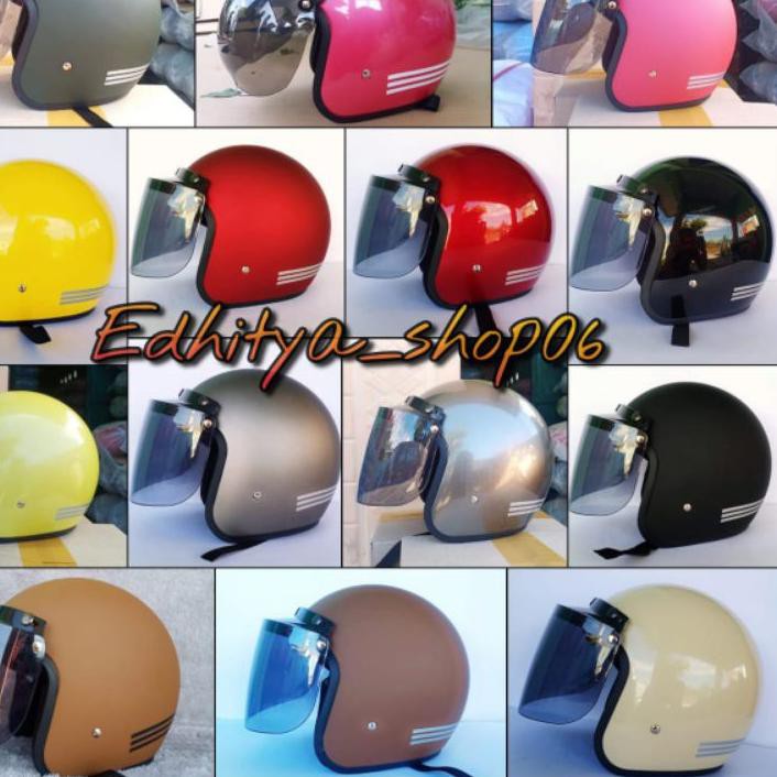 Helm retro bogo sada jitsu juga memiliki pilihan original yang cembung serta datar dengan kaca bening dan smoke.